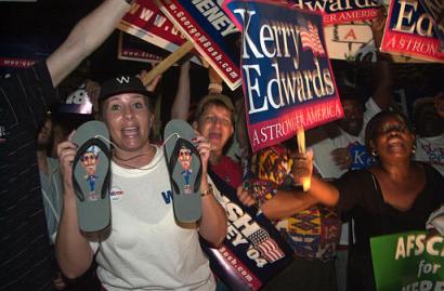 中新網(wǎng)11月3日電 據(jù)美聯(lián)社報(bào)道,選舉日當(dāng)夜,在佛羅里達(dá)州杰克遜維爾市的一個(gè)縣級(jí)選舉官員辦公室前,支持布什和克里的人在相互叫喊著。凱里-約翰遜,布什總統(tǒng)的支持者,正在鏡頭前揮舞著一雙涼鞋,上面印有布什的照片。(春風(fēng))