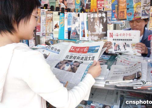十一月三日是美國二00四年大選投票日,福州一名在校女大學生在市區(qū)街頭報攤閱讀國內(nèi)多家報刊有關新聞,關注美國選情。作者:劉可耕