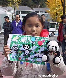 中國四川臥龍自然保護區(qū)是地球上僅存的大熊貓棲息地之一,其數(shù)量占全球大熊貓總數(shù)的百分之二十。圖為當(dāng)?shù)匾晃粌和谙蛴稳苏故咀约旱淖髌,呼吁保護世界最稀有的瀕危動物大熊貓。作者:張華
