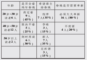 在“最喜歡的演員”中,趙本山、宋丹丹獨(dú)占鰲頭,獲得半數(shù)以上讀者推薦;而“最不喜歡的演員”中,陳佩斯則遭到4位觀眾的“彈劾”。在節(jié)目上,12位讀者認(rèn)為小品、相聲應(yīng)該加強(qiáng),歌舞應(yīng)該減少,8位讀者表示節(jié)目時間太長。