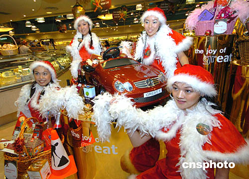 香港一家外國公司11月4日在香港太古廣場由圣誕俏女郎率先推出圣誕禮物籃﹐以吸引消費(fèi)者。作者:趙振清
