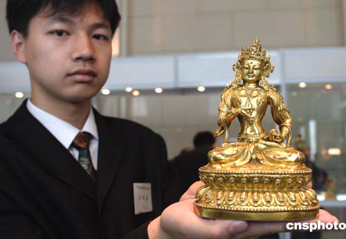 明代永樂年間的一尊銅鎏金金剛薩埵佛像以一百一十萬元人民幣成交,遠(yuǎn)高于估價(jià)。該佛像用紅銅以失蠟術(shù)注澆而成,蓮座上鐫刻楷書陰識(shí)“大明永樂年施”,為明代宮廷造像,是當(dāng)時(shí)的中央政府賜贈(zèng)藏傳佛教高僧的禮物,被學(xué)術(shù)界稱為“永樂青銅塑像”。作者:張煒