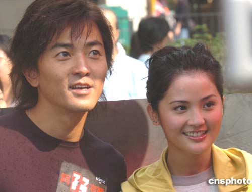 為配合電視劇《阿孖有難》的播出﹐在劇中擔(dān)任主要角色的鄭伊健和蔡卓妍6日在香港尖沙咀街頭造勢(shì)。作者:趙振清