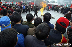 圖:北京海淀警方街頭指導(dǎo)市民滅火技能