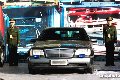 走私大鱷賴(lài)昌星座駕——奔馳S600防彈車(chē),由兩名威嚴(yán)的武警戰(zhàn)士監(jiān)護(hù)。據(jù)悉,該防彈車(chē)重量遠(yuǎn)超普通奔馳車(chē),防彈玻璃為雙層,有三、四厘米厚,輪胎也是防彈的。它將和其它走私車(chē)一同在展覽結(jié)束當(dāng)天進(jìn)行拍賣(mài)。中新社記者:王麗南
