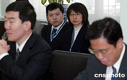 農(nóng)業(yè)部副部長牛盾,十一月十日在北京與臺灣前民進(jìn)黨主席許信良率領(lǐng)的“兩岸農(nóng)業(yè)交流訪問團(tuán)”,就加強(qiáng)兩岸農(nóng)業(yè)合作等問題舉行座談。許信良子女(中)亦出席座談會。中新社記者:滿會喬