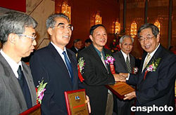 香港何梁何利基金十日下午在北京人民大會堂舉行二00四年度頒獎典禮暨基金成立十周年紀念大會,中國全國人大常委會副委員長許嘉璐(右一)出席并為獲獎人頒獎。該基金設(shè)立“科學(xué)與技術(shù)成就獎”和“科學(xué)與技術(shù)進步獎”兩個獎項,每年評獎一次,獎金分別為一百萬港元、二十萬港元,本年度共有四十九位中國內(nèi)地科學(xué)家獲進步獎,成就獎空缺。作者:宗金柱