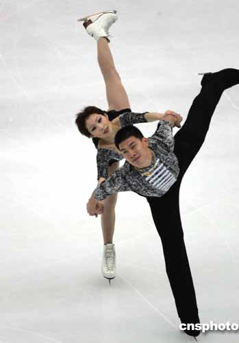中國(guó)隊(duì)派出雙人滑第一組合、兩度世錦賽冠軍申雪/趙宏博出戰(zhàn),他們攜新編動(dòng)作在加拿大站大獎(jiǎng)賽上首演成功奪取冠軍。由于頭號(hào)種子俄羅斯選手托特米安妮娜/馬列寧的缺席,中國(guó)組合是參加本站比賽世界排名最高的運(yùn)動(dòng)員。今天的短節(jié)目比賽,申雪/趙宏博在九對(duì)選手中第六個(gè)出場(chǎng),盡管在做拋跳三周時(shí),申雪落地單手扶冰出現(xiàn)小失誤,但這并沒(méi)有影響他們之后的發(fā)揮,在《月光》悠揚(yáng)的樂(lè)曲聲中順利完成了八個(gè)規(guī)定動(dòng)作,以六十六點(diǎn)三八分位列第一。
