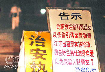 中新網(wǎng)11月12日電 據(jù)新快報(bào)報(bào)道,面對(duì)色誘搶劫案件重新抬頭,廣州警方除出動(dòng)大批警力清掃市內(nèi)“企街女”集中地外,日前更在“高危地段”豎起警示牌,警告“好色男士潔身自愛(ài),以免受騙人財(cái)兩空”。