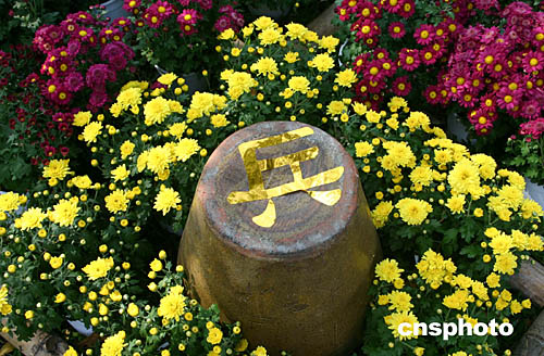 11月12日,臺北菊展在當年蔣介石的士林官邸開幕。圖為門前的“棋奕菊間”花區(qū),各色菊花間擺放著中國象棋棋子,創(chuàng)意十足。中新社記者:董會峰