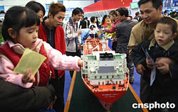 重慶高新技術(shù)交易會(huì)展出一艘四點(diǎn)六萬噸級的成品油輪船艦?zāi)P臀齾⒂^者