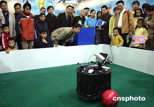 第六屆重慶高新技術(shù)交易會暨第二屆中國國際軍轉(zhuǎn)民科技博覽會十三日在重慶開幕,共展出近二千五百項(xiàng)科技項(xiàng)目。圖為“足球機(jī)器人”正在臨時圍成的球場里“踢”足球,吸引了眾多參觀者的目光。作者:郭晉嘉