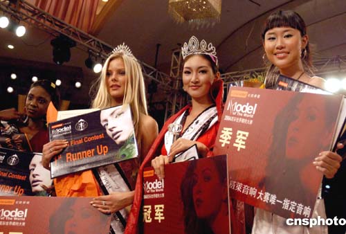 二零零四星際世界模特大賽全球總決賽,十一月十四日晚在廣東珠海舉行,五十位來自全球四十一個國家的專業(yè)模特參加角逐。泰國選手(中)獲得冠軍,烏克蘭選手(左)獲得亞軍,中國王琤(右)獲得季軍。作者:劉衛(wèi)勇