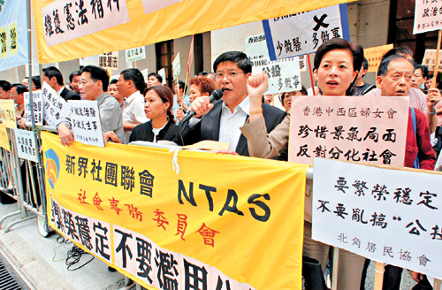 包括新界社團(tuán)聯(lián)會(huì)、香港島各界聯(lián)合會(huì)、中西區(qū)婦女會(huì)、北角居民協(xié)會(huì)等多個(gè)團(tuán)體的數(shù)十名代表昨天一早齊集于立法會(huì)大樓外,手持“珍惜景氣局面、反對(duì)分化社會(huì)”、“要繁榮穩(wěn)定、不要亂搞‘公投’”、“反對(duì)做騷、要多做實(shí)事”等抗議標(biāo)語(yǔ),并高叫口號(hào),強(qiáng)烈反對(duì)“公投”動(dòng)議。