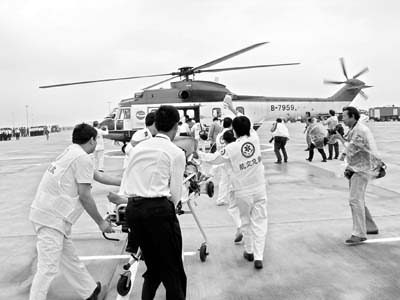 機(jī)場(chǎng)濃煙滾滾,兩輛消防車(chē)對(duì)準(zhǔn)飛機(jī)噴水,機(jī)組迅速打開(kāi)艙門(mén),施放緊急滑梯疏散旅客。機(jī)場(chǎng)醫(yī)療急救力量8輛救護(hù)車(chē)、60名擔(dān)架隊(duì)員也到達(dá)現(xiàn)場(chǎng),醫(yī)療人員根據(jù)受傷輕重分別在場(chǎng)地上不同區(qū)域插上紅、黃、綠、黑、白五色旗,擔(dān)架隊(duì)員抬著擔(dān)架沖向失事飛機(jī)迅速將傷員轉(zhuǎn)離飛機(jī),送往臨時(shí)搭建的醫(yī)療驗(yàn)傷區(qū)。