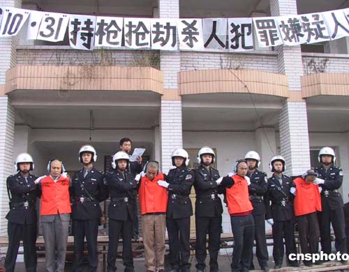 中新網(wǎng)重慶11月17日電(記者鄒輝)十月三十一日發(fā)生在重慶江北區(qū)盤溪蔬菜批發(fā)市場外的持槍搶劫殺人案成功告破,重慶警方今天下午對捉獲的四名犯罪嫌疑人進行了公開逮捕。警方稱,該案持槍犯罪嫌疑人胡某在拒捕時被擊傷,經(jīng)醫(yī)院全力搶救無效已死亡。
