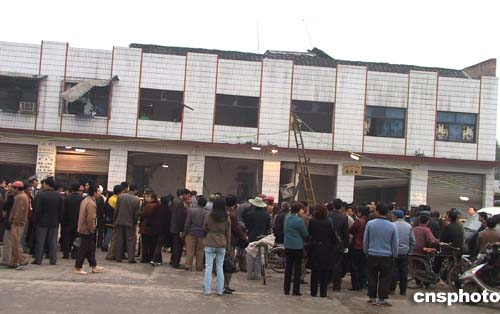 十九日清晨,在爆炸現(xiàn)場,幸存者肖述容(正面,女)被人圍住詢問爆炸發(fā)生時的情況。作者:鄒輝