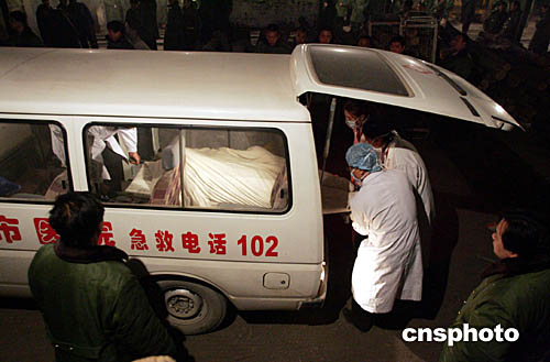二零零四年十一月二十一日晚,經(jīng)過連續(xù)搜索搶救,河北省邢臺(tái)市沙河礦難死亡人數(shù)又有所增加,又有十多名礦工的遺體被抬出金鼎鐵礦巷口。中新社記者:武仲林