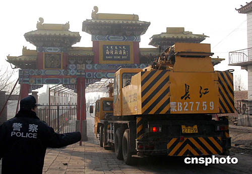 11月22日上午,緊急從包頭鋼鐵公司調來的重型吊車抵達空難事故地點——包頭南海公園,協(xié)助打撈11.21空難失事客機的殘骸。中新社記者:張宇