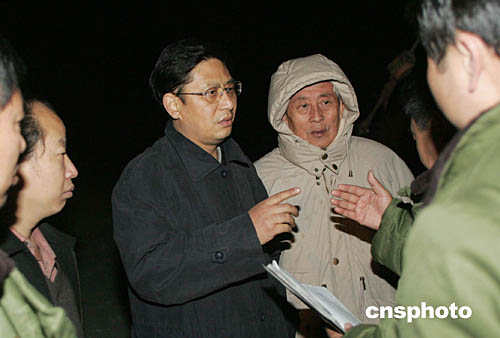 | 二零零四年十一月二十二日晚,中國國家安全生產(chǎn)監(jiān)督管理局副局長孫華山(左三)在“11.20”河北沙河礦難事故現(xiàn)場指揮救援。截止二零零四年十一月二十二日十九點三十分,“11.20”河北沙河礦難遇難礦工已達五十七人,另有三人下落不明。中新社記者:武仲林