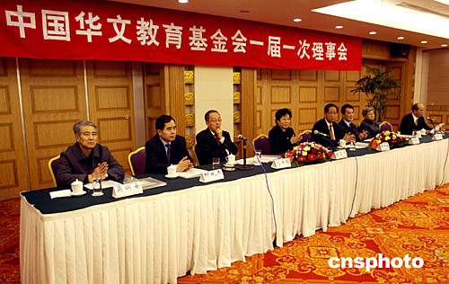 中國華文教育基金會一屆一次理事會十一月二十五日在北京世紀飯店舉行,二十三位理事和監(jiān)事出席會議。會議審議并通過了中國華文教育基金會章程(草案),確立了基金會首批募捐和資助項目并選舉了理事長、秘書長。中新社記者:史利