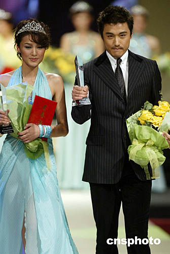 中國國際時(shí)裝周二零零四年度最佳職業(yè)模特獎十一月二十五日晚在北京揭曉,胡兵(右)和韋杰獲此殊榮。中新社記者:盛佳鵬
