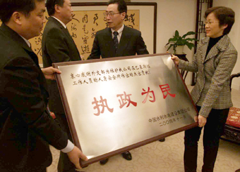 中新網(wǎng)11月26日電 中國(guó)外交部副部長(zhǎng)武大偉今天在外交部接受了中國(guó)水利水電集團(tuán)公司贈(zèng)送的“執(zhí)政為民”匾牌。