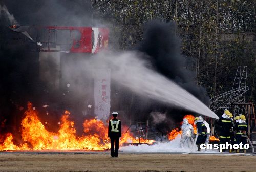在處置連環(huán)爆炸恐怖事件演練中,公安消防正合力撲滅“恐怖分子”實(shí)施爆炸引起的大火。