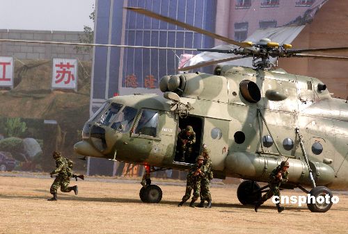 反恐應(yīng)急分隊機(jī)降突擊隊搭乘運(yùn)輸直升機(jī)機(jī)降后迅速組織戰(zhàn)斗 。