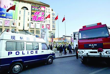 昨天下午1點(diǎn),北京西單中友百貨遭到“炸彈”恐嚇。為防止爆炸后起火,20輛消防車守衛(wèi)在中友旁邊。