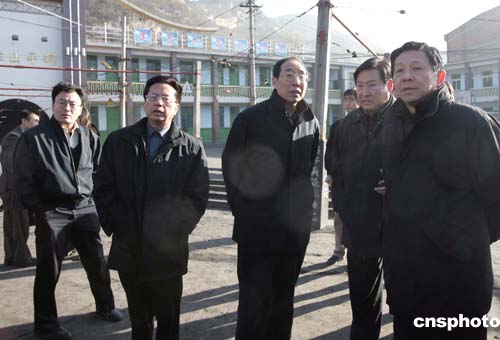 國有企業(yè)陜西銅川礦務局陳家山煤礦11月28日發(fā)生特大瓦斯爆炸事故,以國務院副秘書長尤權(右三)為組長的國務院工作組抵達后,29日上午在現(xiàn)場指導和協(xié)調人員進行搶救并開展事故調查工作。陜西省代省長陳德銘(右一)和國家安全監(jiān)管局副局長趙鐵錘(右二)等也在現(xiàn)場組織搶救。作者:任晨鳴