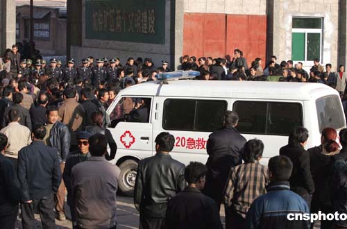十一月二十九日下午,救護車在發(fā)生瓦斯爆炸事故的陜西銅川礦務局陳家山煤礦外待命,隨時準備救治至今下落不明的礦工。作者:任晨鳴