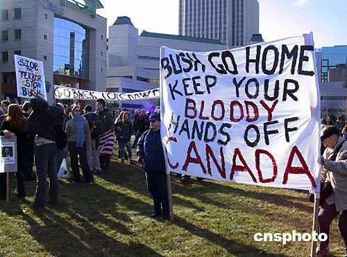 布什說他在渥太華受到了“非常友好熱情的招待”。但是在聯(lián)合記者招待會行的外面,大批抗議示威的加拿大人與警察發(fā)生沖突。他們高舉布什是“國際恐怖大佬”的牌子,要求布什“結(jié)束在伊拉克的屠殺”。有些示威者干脆說:“布什,回家吧!”