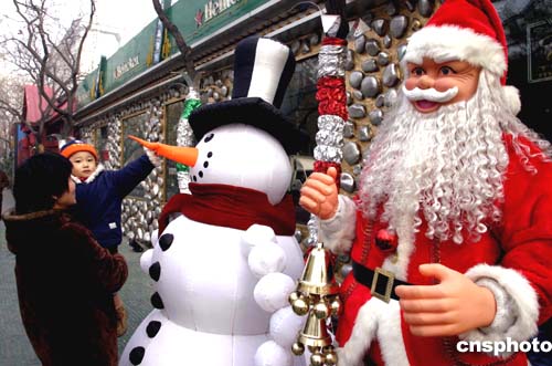 十二月初,在酒吧林立的北京三里屯,商家提前請(qǐng)出圣誕老人招徠顧客。作者:張煒