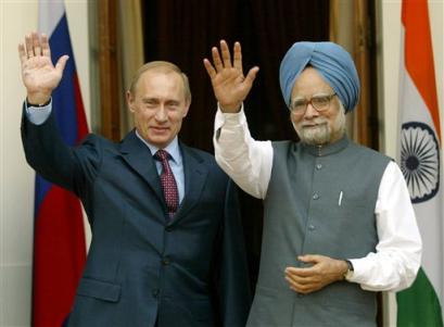 在3日普京與印度總理辛格的會晤后,雙方舉行了聯(lián)合新聞發(fā)布會。普京表示,俄羅斯將支持印度躋身聯(lián)合國安理會常任理事國行列,稱對此將不會行使一票否決權;辛格則表示,印度全力支持俄羅斯加入世貿組織,稱俄為世貿148個成員國以外最大的經(jīng)濟體。