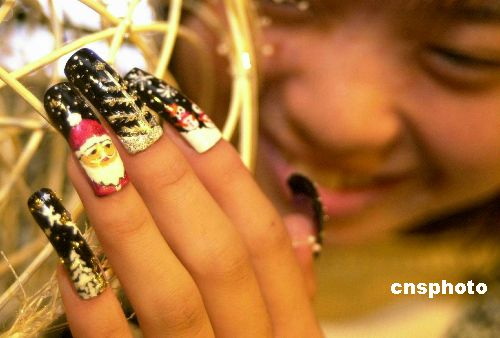 12月5日,市民張小姐在美甲中心為自己的指甲增添的一個圣誕老人和飄著雪花的圣誕樹。據(jù)介紹,這些“圣誕老人指甲”全部是手繪在人造指甲片上,然后使用特殊的粘貼工藝與正常指甲結(jié)合的天衣無縫,一個多月也不會脫落。圣誕節(jié)臨近,這種獨(dú)具個性的“圣誕”指甲受到許多新潮女孩的喜愛。趙健鵬 攝