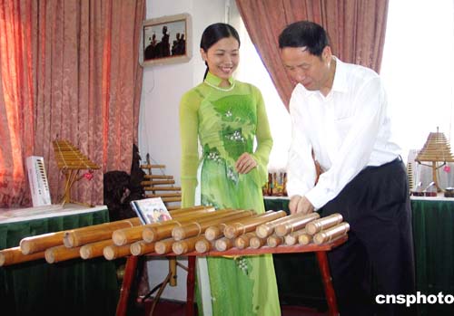 圖:越南女藝人教游客演奏樂曲
