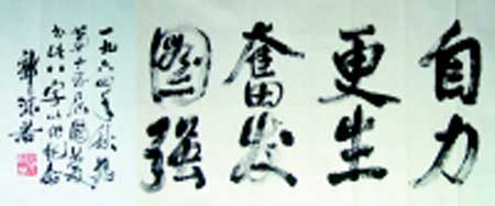 據(jù)了解,這幅寫在1.42米×3.57米宣紙上的行書“自力更生奮發(fā)圖強(qiáng)”,八個(gè)字蒼勁有力、氣勢(shì)磅礴。一些人士分析,這恐怕是郭老書寫的最大書法作品了。