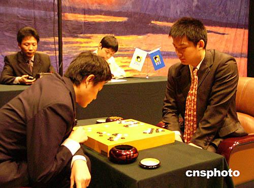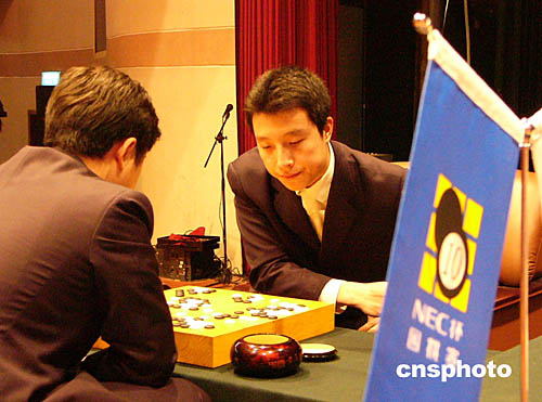 中新社福州十二月十一日電 第十屆NEC杯圍棋快棋賽半決賽今日下午在福州大戲院落子。古力七段和常昊九段先后擊敗周鶴洋九段和孔杰七段,闖入冠亞軍決賽。