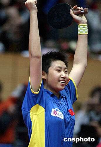 十二月十二日,年僅十六歲的小將郭躍在北京舉行的大眾汽車(chē)二零零四年國(guó)際乒聯(lián)職業(yè)巡回賽總決賽女單半決賽中戰(zhàn)勝牛劍鋒,獲女單冠軍。中新社記者:武仲林