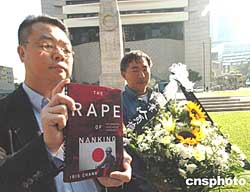 兩名香港市民手持聲討日本軍國(guó)主義罪行的書籍和花籃,13日在香港和平紀(jì)念碑前肅立,聲討日本軍國(guó)主義的罪行,為遇難者哀悼。作者:趙振清