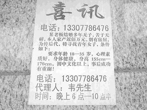 在這張名為“喜訊”的廣告上,白紙上黑體字特別顯眼,吸引了不少過路的人駐足觀閱。其廣告內(nèi)容為:“某老板結(jié)婚多年無子,苦于無耐(奈),本人家產(chǎn)近百萬元,別(另)有房屋,為傳后代,特尋找青年女子,條件如下:要求年齡18—35歲,心理素質(zhì)好,身體健康,身高155CM—170CM,初中文化以上,事后成功有重謝!”。