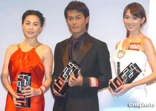港臺(tái)紅星劉嘉玲﹑古天樂﹑林志玲14日晚在香港會(huì)展中心身著紅﹑黑﹑白主題色調(diào)服裝同臺(tái)出席諾基亞7280流動(dòng)電話推出儀式。作者:趙振清