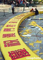 工人正在澳門佑漢公園趕制喜慶牌匾,為慶祝澳門特別行政區(qū)成立五周年,十八日澳門街坊總會將在此地舉辦“金蓮?fù)缕G齊鼓舞,彩燈璀璨慶回歸”系列大型慶;顒。作者:梁永強