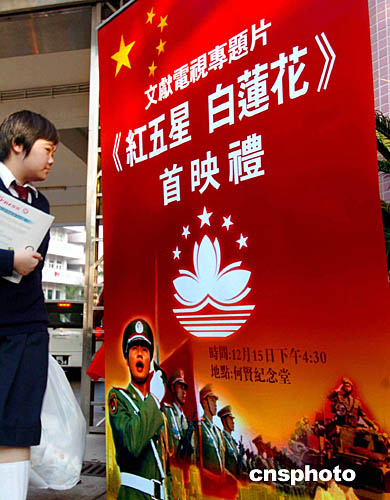 中新社澳門十二月十五日電(記者黃鴻斌)為慶祝澳門回歸祖國五周年而開拍的八集文獻(xiàn)電視專題片《紅五星•白蓮花》拍攝完成,十五日下午在濠江中學(xué)何賢堂舉行盛大首映禮。澳門特區(qū)政府社會文化司司長內(nèi)崔世安、中聯(lián)辦宣傳文化部部長孔繁壯、駐澳部隊(duì)副司令黃文科大校等聯(lián)合主持首映禮儀式。