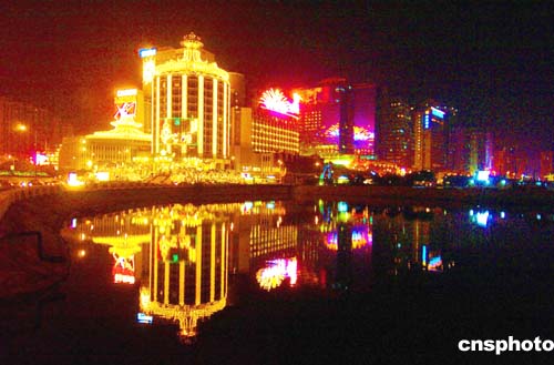 澳門回歸祖國五周年前夕,澳門一些大型建筑物晚上燈火通明,五彩繽紛,為這座不夜城增添了節(jié)日喜慶氣氛。作者:宋吉河
