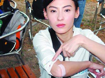 張柏芝在拍廣告時(shí)不改其貪玩的個(gè)性,與古天樂打鬧,還不慎擦傷玉臂。張柏芝很傷心地向記者展示她手臂上的傷痕說:“今天拍這個(gè)廣告主要是說我和古仔(古天樂)都是射擊好手,所以剛才在拍攝的空隙我就和他拿著手槍追逐互射,他斗不過我,就拿桌上的產(chǎn)品來擲我,我在左閃右避的時(shí)候手臂就碰到背景板,這些背景板都是用木制的,很粗糙,所以就刮傷了手,皮都掉了,當(dāng)場流血!