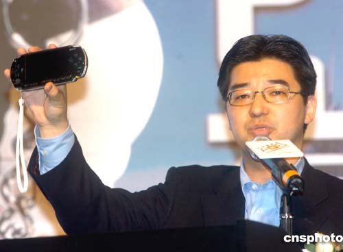 2004年亞洲游戲展17日在香港會(huì)展中心開幕﹐日本索尼計(jì)算機(jī)娛樂PSP業(yè)務(wù)籌備室主任茶谷公之先生在開幕式上展示手提游戲機(jī)。作者:趙振清