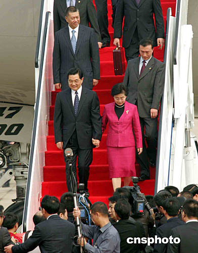 胡錦濤在何厚鏵的陪同下,向歡迎的當(dāng)?shù)孛癖姄]手致意。
