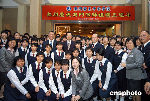 胡錦濤與夫人劉永清在澳門特首何厚鏵的陪同下參觀澳門勞工子弟學(xué)校,受到學(xué)校師生的熱烈歡迎。